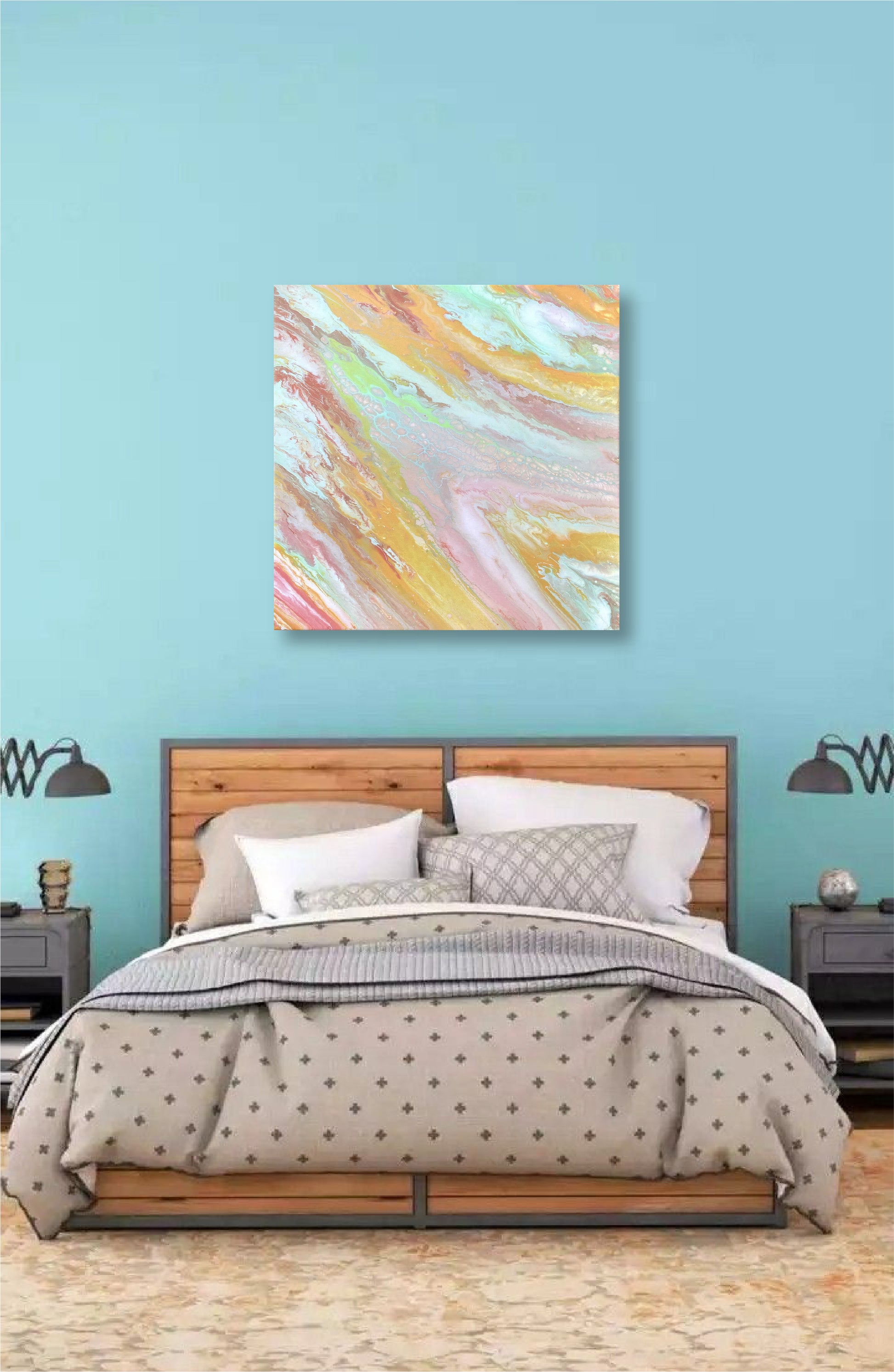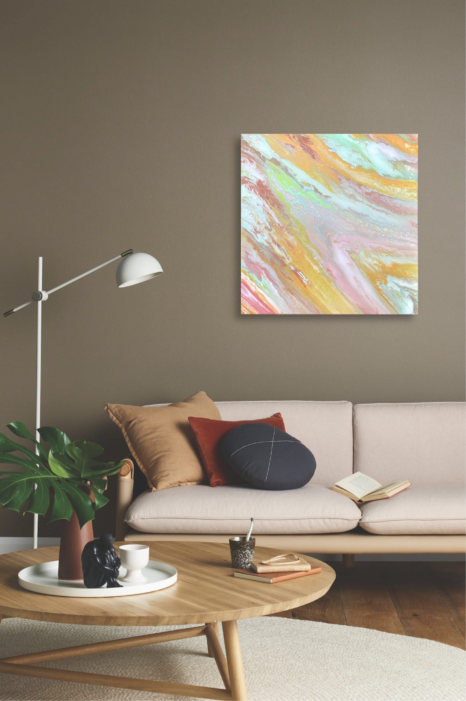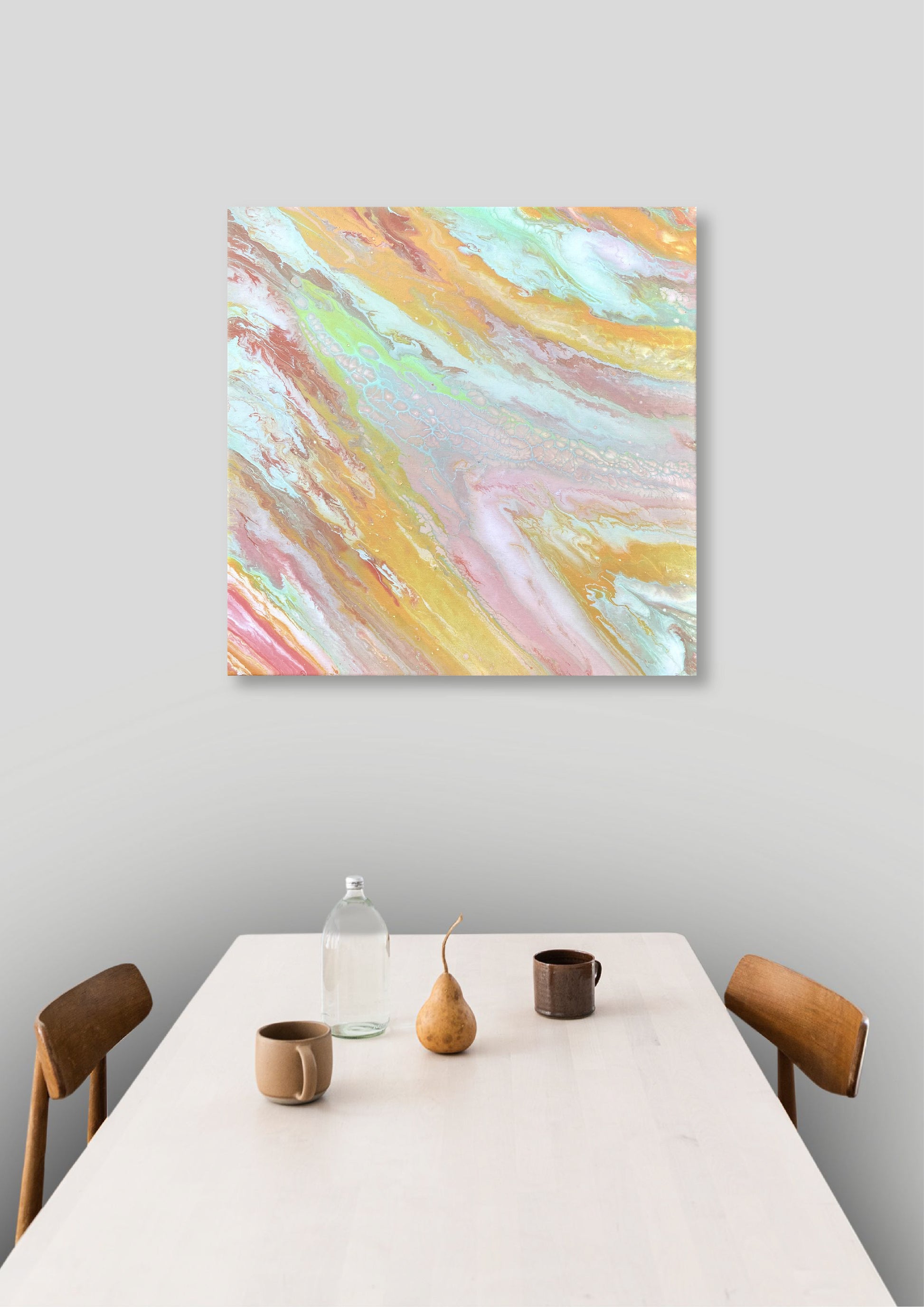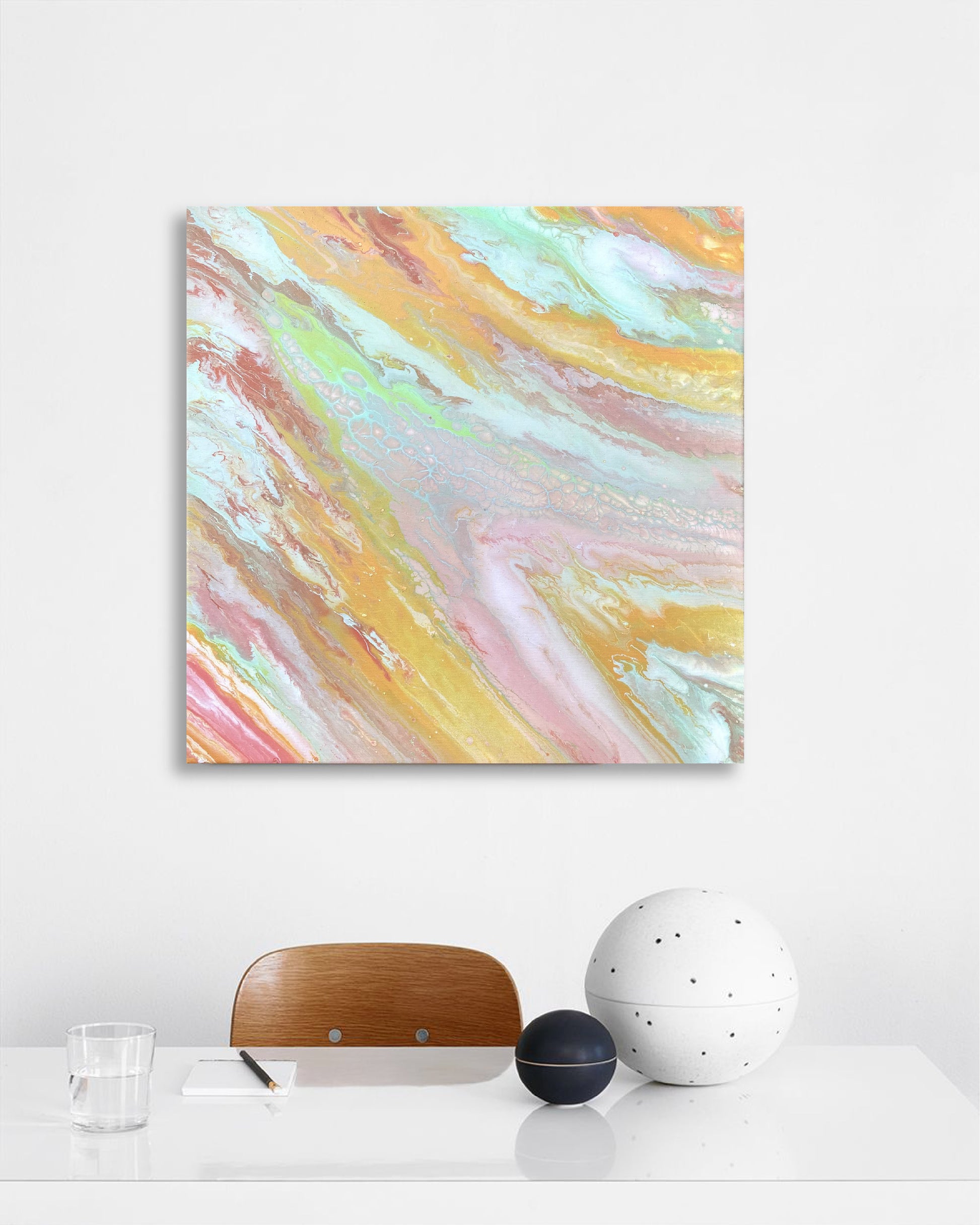 This artwork is a swirl of color and emotion — soft blends of pink, mint, caramel, and gold flow together to create a sense of lightness and joy, as if the world has momentarily turned into cotton candy. Candy captures the feeling of pure delight and simple happiness — that childlike moment when everything feels bright, sweet, and full of wonder.