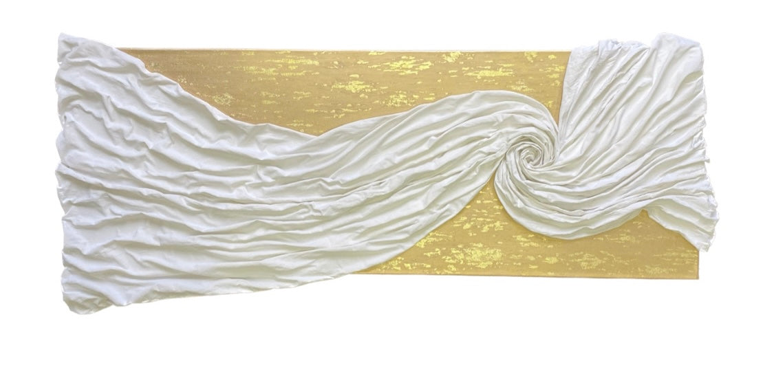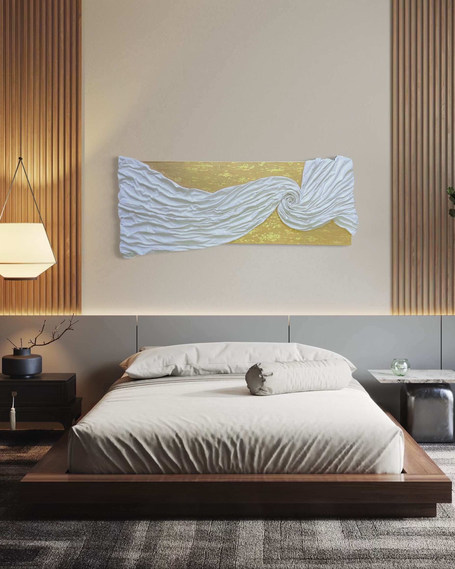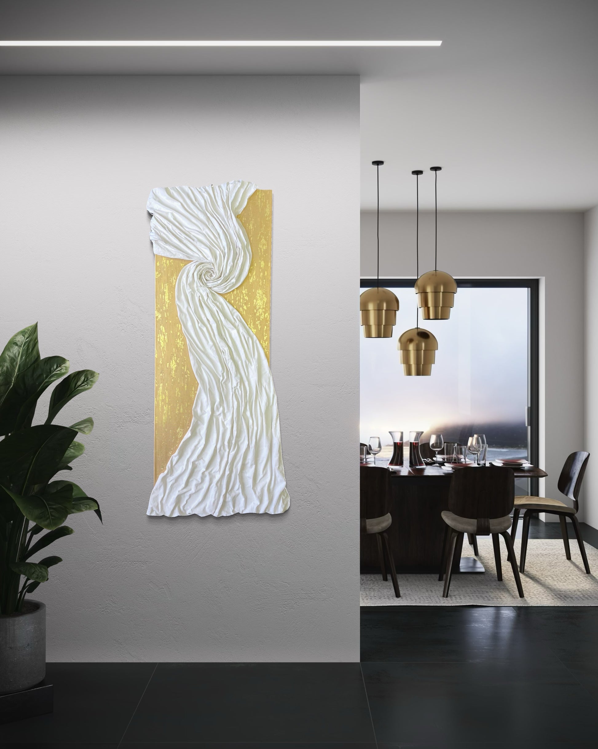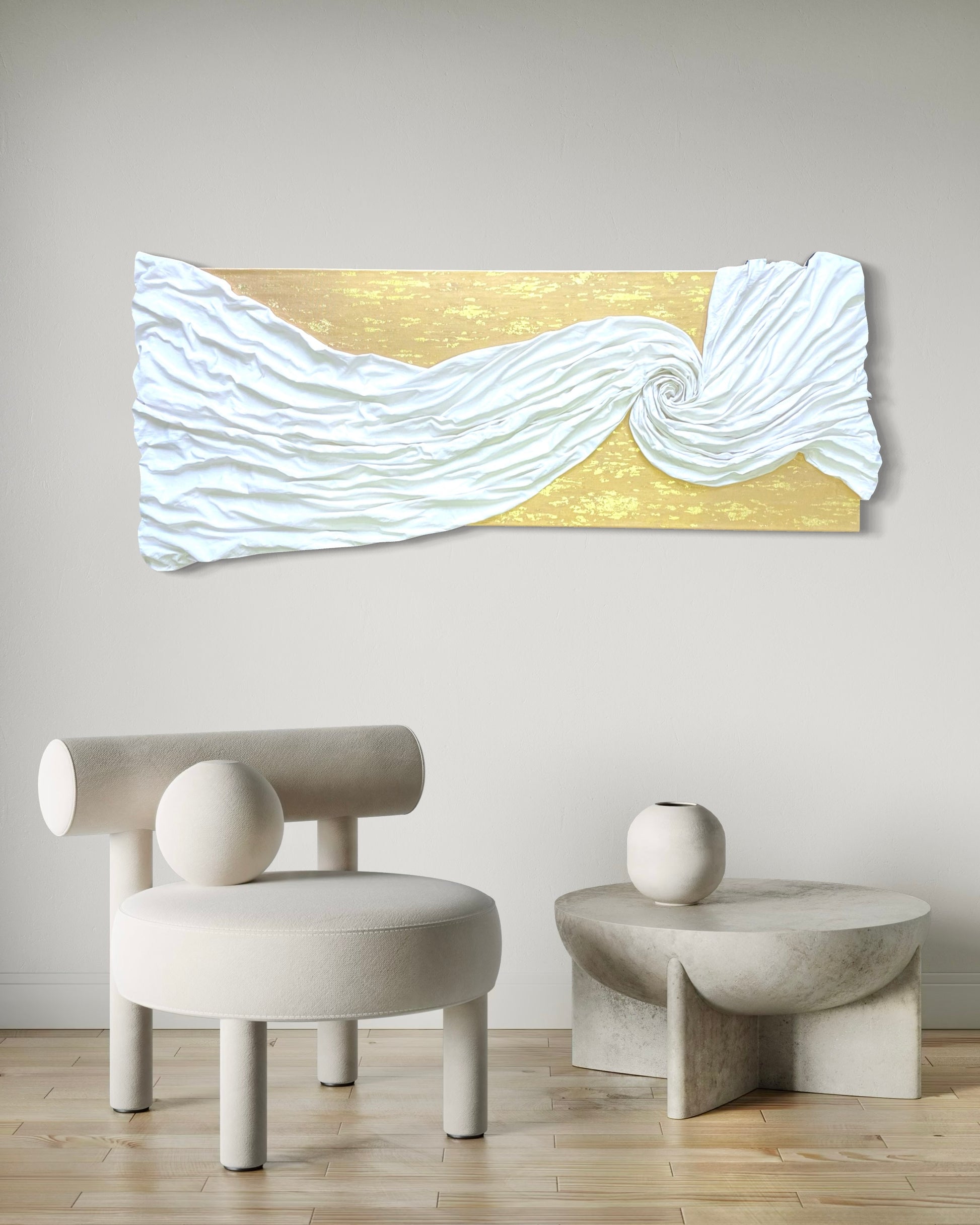 The white fabric, coiled into a spiral, seems to capture the breath of the universe — the instant when energy transforms into matter. The gold is not merely a background but a space of infinity from which all existence emerges.
